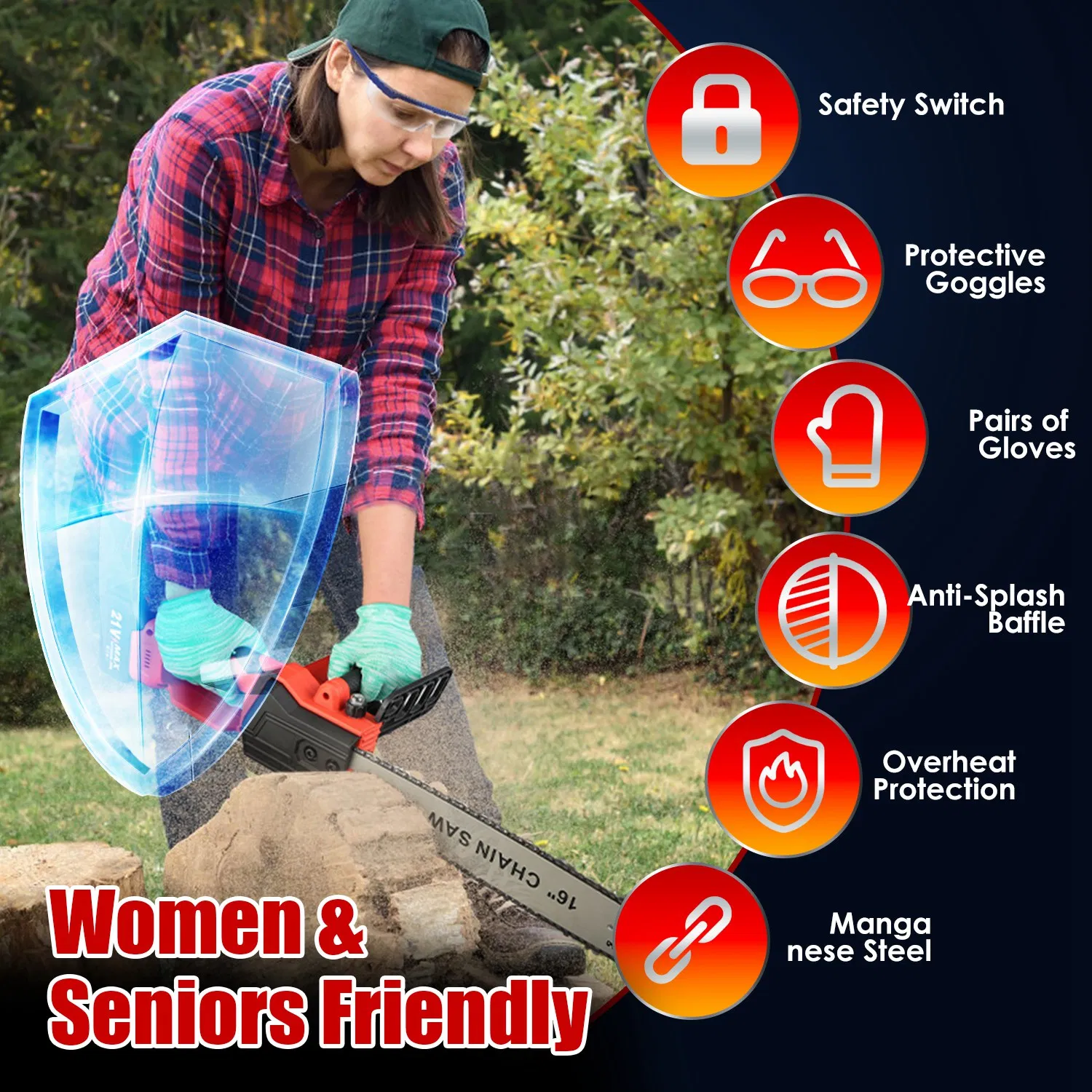 *Safe & Easy To Use*:Safety switch requires you to hold the chainsaw steady while simultaneously pressing the start button,effectively minimizing the risk of injury caused by sudden starts or unexpected movements. The front baffle acts as a barrier against flying debris and wood chips,1 pair of gloves and 1 goggle are to protect your hands and eyes. Furthermore,overheating protection will auto shut down the chainsaw until it cools down.