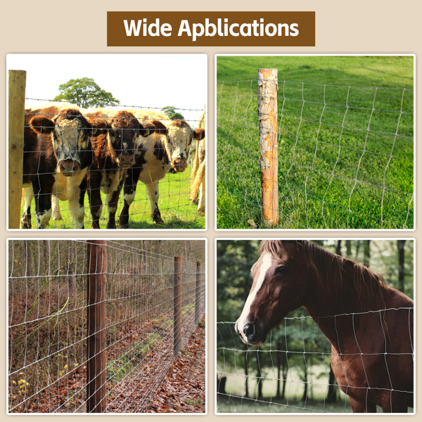 • 【Wide Application】 The farm fence is versatile and suitable for a wide range of animals, including cattle, horses, sheep, dogs, and deer. It serves as an ideal solution for protecting livestock, poultry, gardens, and pets, making it a valuable asset for various farming needs.
