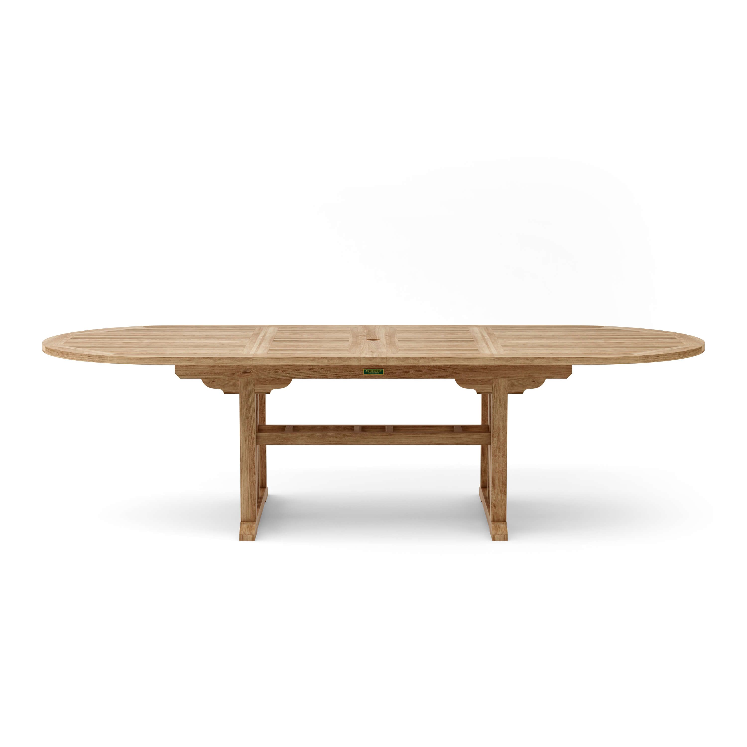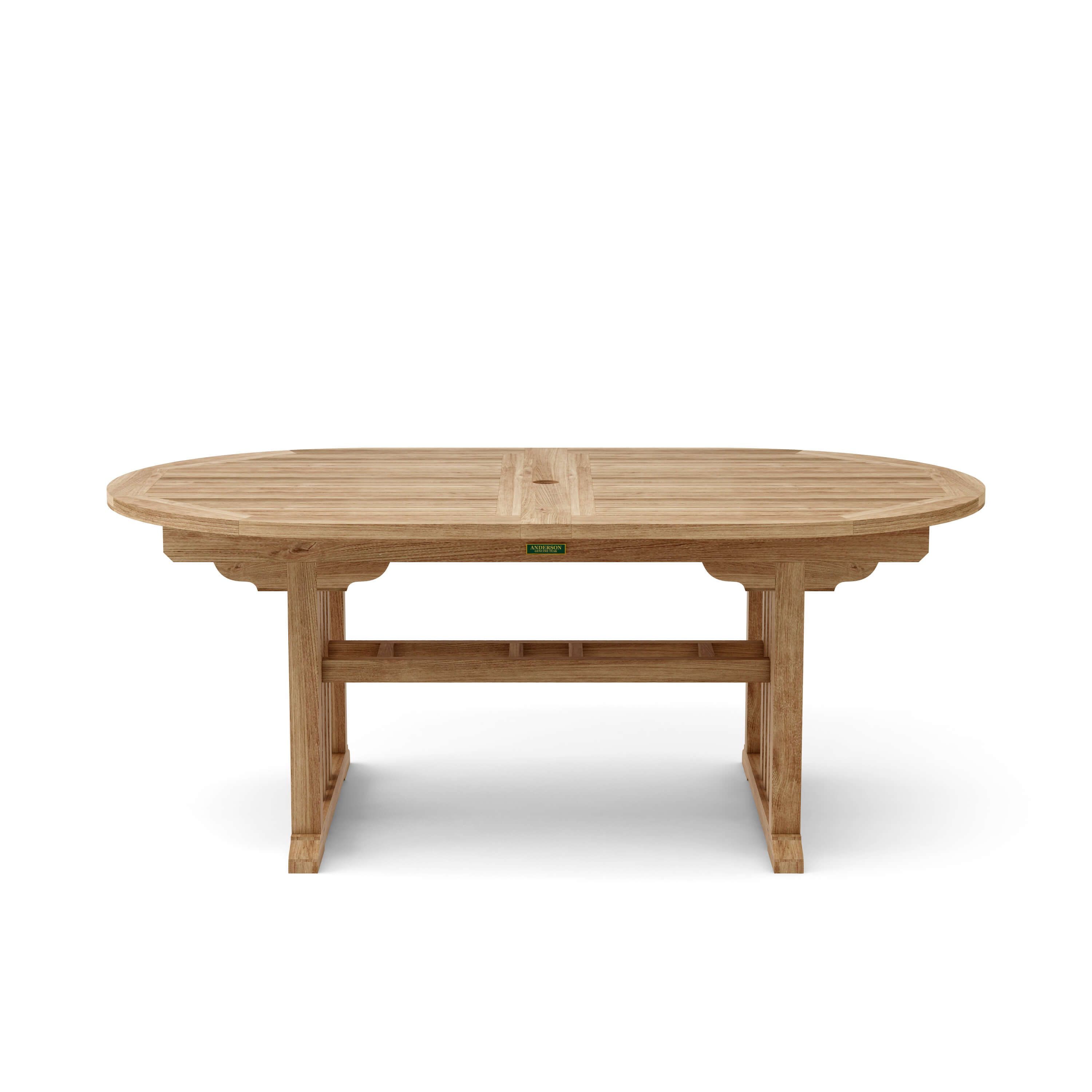 This solid teak 'Sahara Oval Double Extension Table' makes the perfect addition to your patio or yard. The unique built-in butterfly pop-up leaf enables you to open and close your table in less than 15 seconds. The leaf folds away for easy storage under the table when not in use. The table stands 29″ high and is 43″ wide by 74″ long, reaching up to 106″ in length when fully extended. The table can be extended with 1 or 2 leaves, depending on the length you choose and seats 10 to 12 people comfortably. Includes umbrella hole in center with brass plug when not in use.