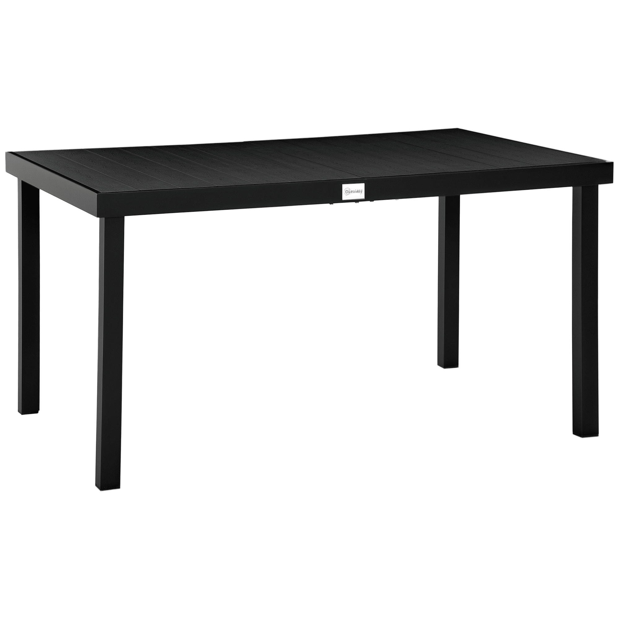 Serve dinner with Outsunny. This table is ready and stable whether placed on the patio, porch, poolside, or any other outdoor area. Made of water and weather-resistant plastic, it still offers the rustic style of natural wood with less weight and easy cleanup. Supported by a aluminum frame. This outdoor patio table on the balcony is great for dinner, drinks, afternoon tea, or coffee.