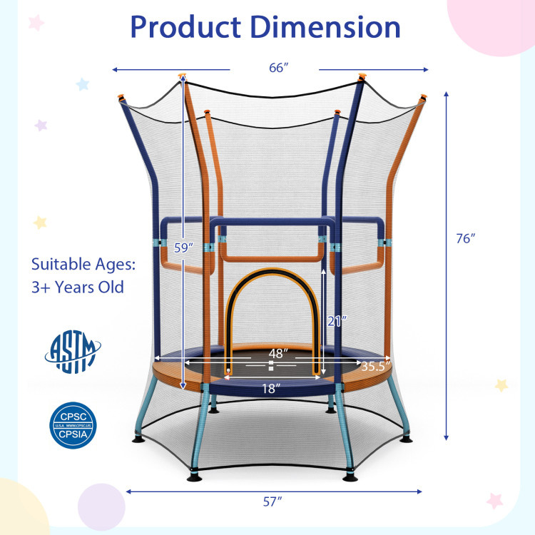 1.360° All-round Protection: This mini trampoline is specially equipped with the 59-inch heightened enclosure net, which ensures your child's safety while jumping. Likewise, the bottom enclosure net can prevent children from climbing and protect their security.